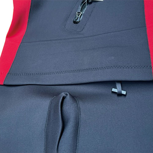 ウェットドライスーツ(型番:JWD-402)はフロント部分に斜めの防水ジッパーが採用されており、腕周りの動きを妨げず、1 人で着脱が可能な位置に設置されています。