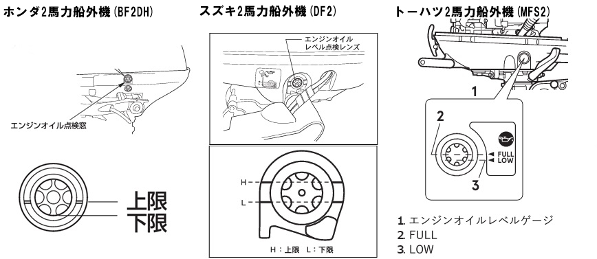 メーカーによって点検窓のオイル上限、下限のラインが異なります。お間違えないようにしてください。