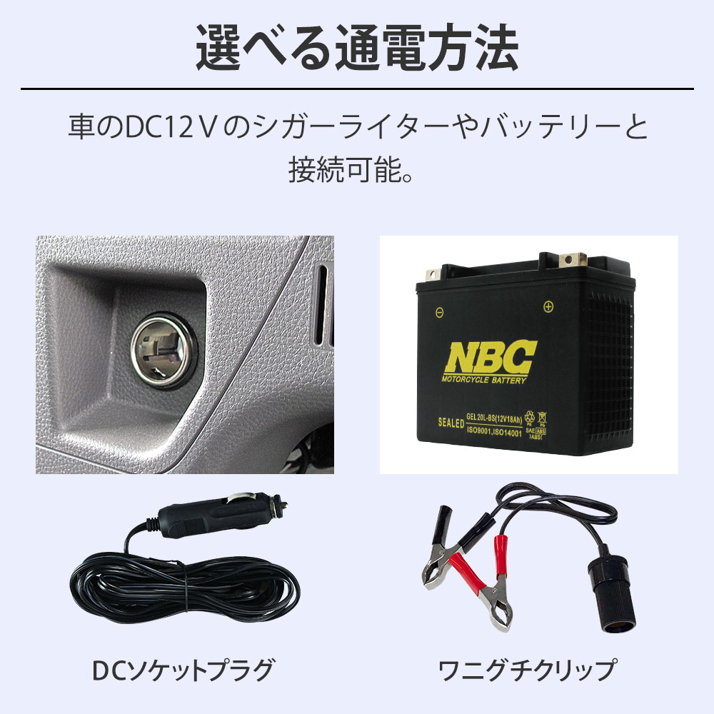 ・通電方法が2種類(シガーライター用プラグ、バッテリー用ワニグチクリップ)