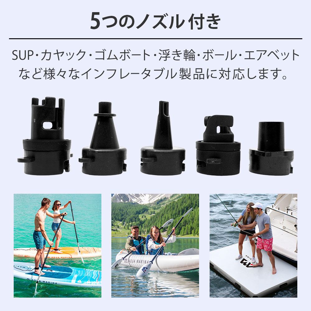 ・5種類のノズル付きで、SUP・ゴムボート以外にも浮き輪やビニール製カヌー、エアベッドなど幅広く対応!